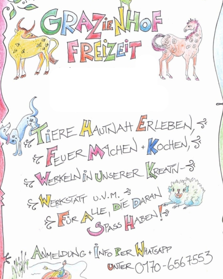 Auch in unseren Sommerfreizeiten dreht sich am Grazienhof alles um unsere Tiere, die Natur, Feuermachen, Kochen und ums Werkeln in unsrer Kreativwerkstatt...